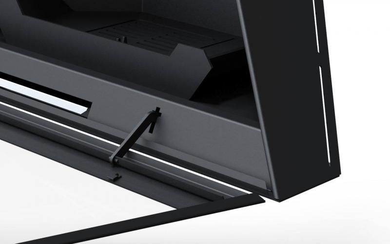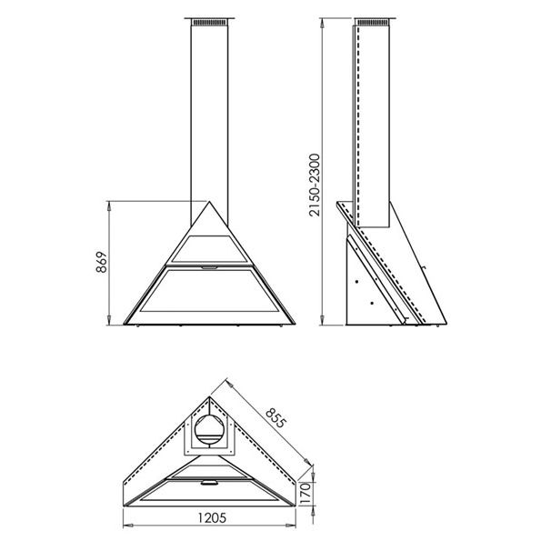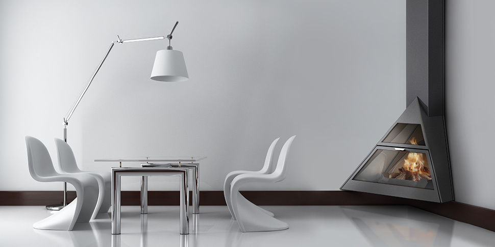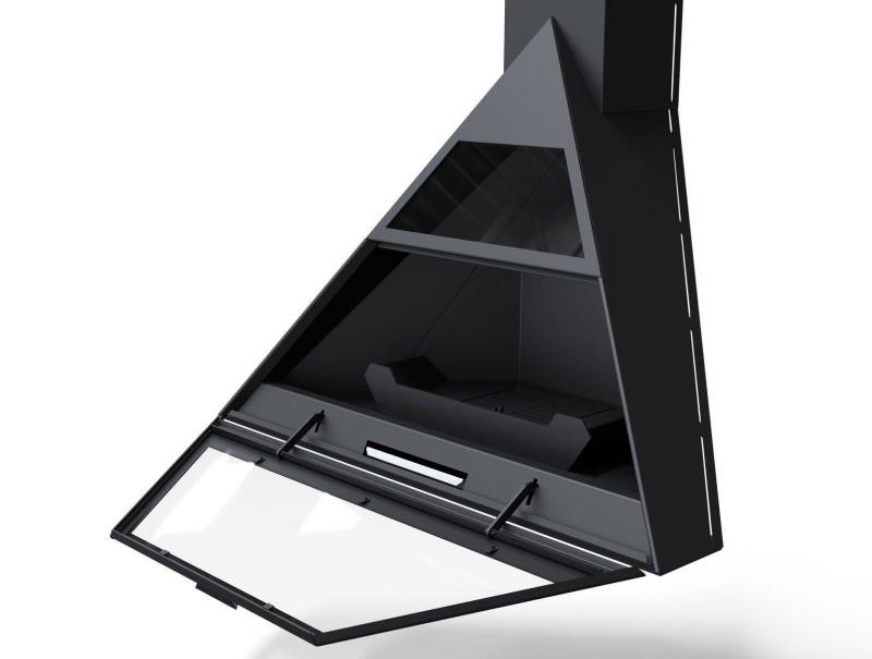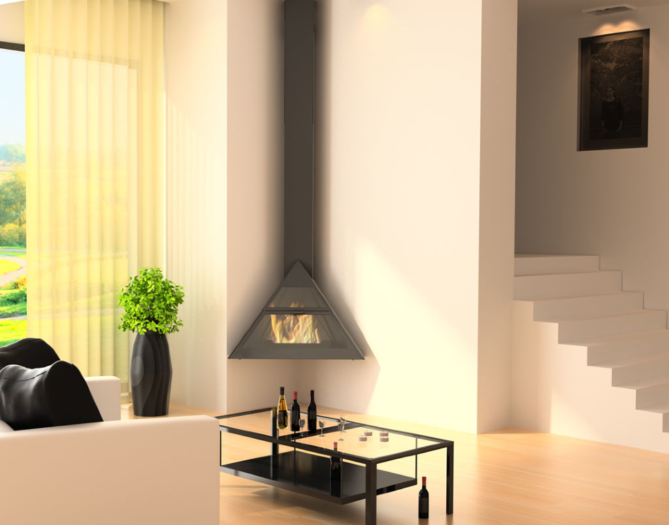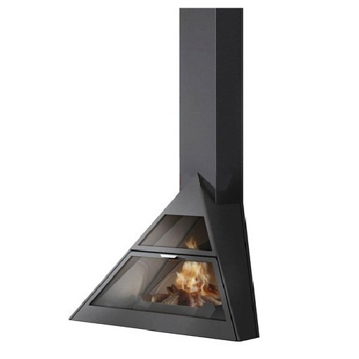 Камин угловой подвесной с верхним подключением дымохода и прямым стеклом Traforart ADMETO RINCON