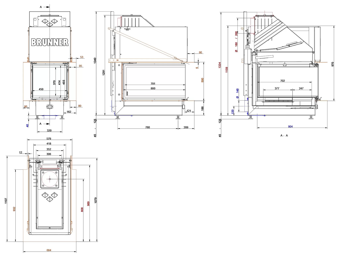 Каминная топка панорамная с трехсторонним остеклением и подъемной дверцей Brunner BKH Panorama 45-80-45-80 ST