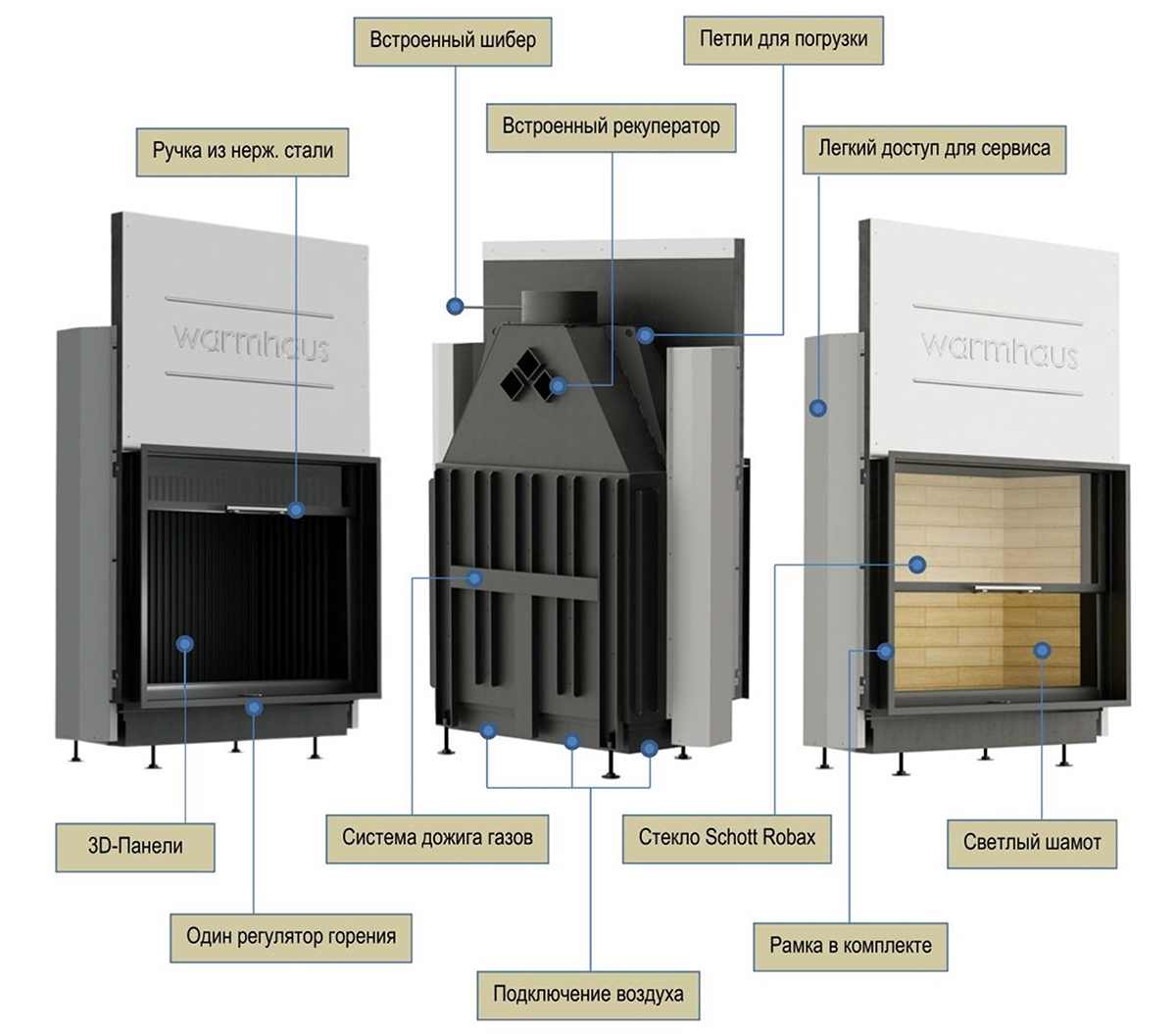 Дополнительные опции включают функцию подового горения для особого режима работы, встроенную шиберную заслонку для регулировки тяги и адаптеры для подводки воздуха. Все механизмы выполнены из нержавеющей стали и не требуют смазки, что упрощает обслуживание.