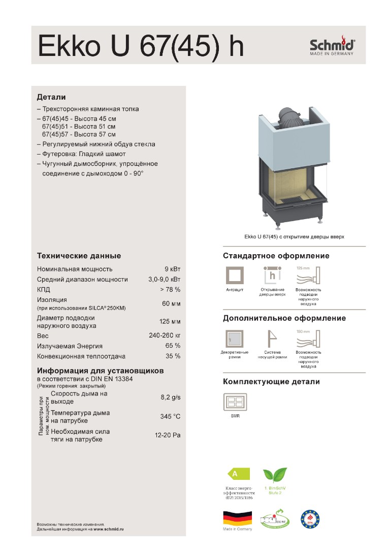 Каминная топка Schmid Ekko U 67(45)57 h - это воплощение немецкой инженерной мысли в области отопительного оборудования. Модель разработана с учетом последних достижений в области теплотехники и отличается надежностью, долговечностью и простотой в эксплуатации.