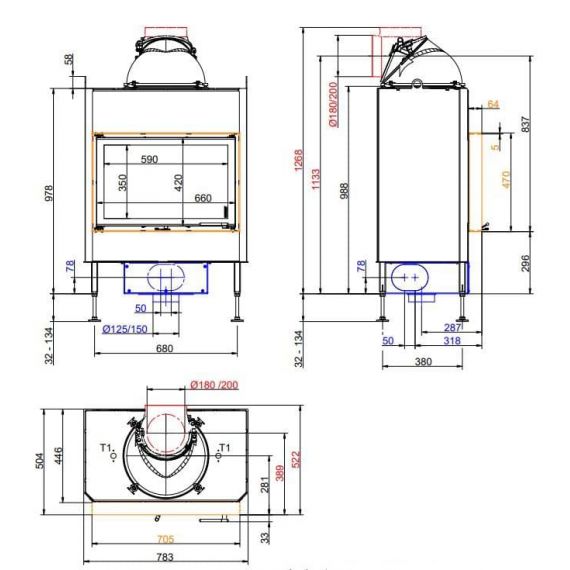 Конструкция топки включает шамотную футеровку, которая обеспечивает длительное сохранение тепла и защиту стального корпуса. Боковое открывание дверей делает эксплуатацию удобной и безопасной. Возможность подключения к дымоходу диаметром 180 или 200 мм предоставляет гибкость при монтаже.