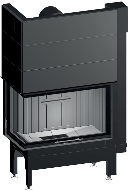 Конструкция топки предусматривает левостороннее угловое остекление, что позволяет оптимально вписать ее в угловое пространство помещения. Система вторичного дожига обеспечивает полное сгорание топлива, повышая КПД до 80% и снижая образование сажи. Встроенный зольник с выдвижной конструкцией упрощает обслуживание, а система обдува стекла поддерживает его чистоту на протяжении всего процесса горения.