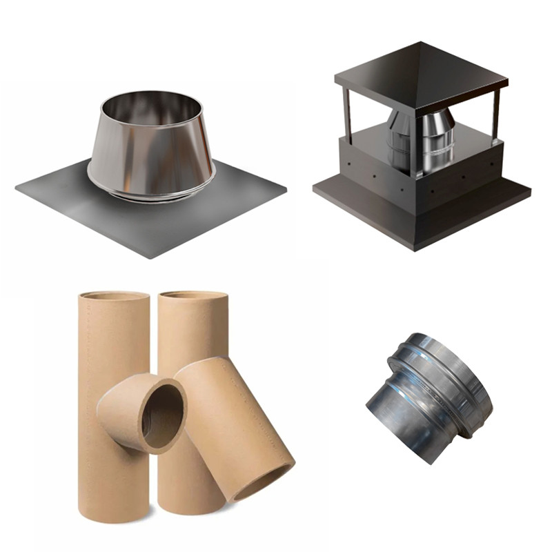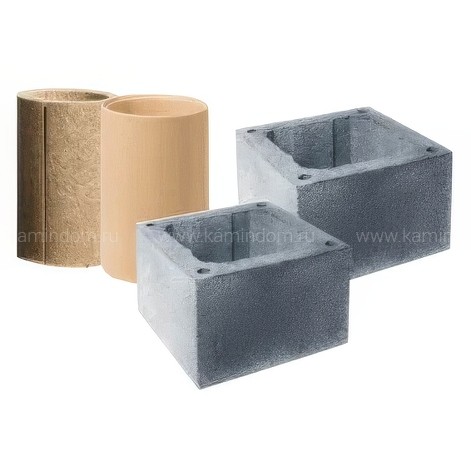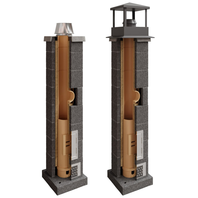 Трехслойная система дымохода обеспечивает статическую устойчивость керамической трубы и позволяет ей свободно расширяться при нагреве независимо от внешней оболочки. Теплоизоляционные цилиндры класса НГ с плотностью 120 кг/м³ эффективно защищают от перегрева наружных поверхностей. Керамзитобетонные блоки оснащены каналами проветривания и армирования, что способствует оптимальной циркуляции воздуха.