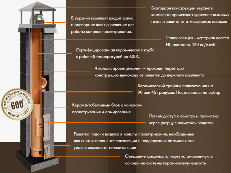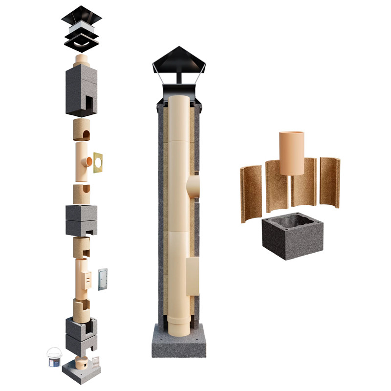 Система состоит из трех основных слоев: внутренней керамической трубы толщиной 15 мм, теплоизоляционного цилиндра и внешней керамзитобетонной оболочки. Такая конструкция обеспечивает статическую устойчивость и позволяет керамической трубе свободно расширяться при нагреве. Наружные размеры блоков составляют 380×380 мм, что делает систему компактной и удобной для монтажа.