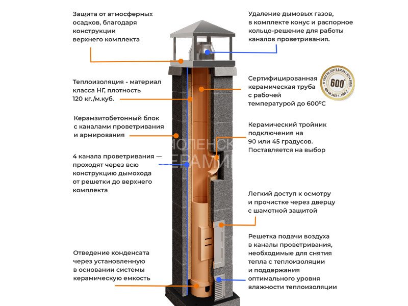 Трехслойная система дымохода состоит из внутренней керамической трубы высотой 330 мм, теплоизоляционных цилиндров такой же высоты и керамзитобетонных оболочек размером 380×380×240 мм. Такая конструкция обеспечивает статическую устойчивость керамической трубы и позволяет ей свободно расширяться независимо от внешней оболочки. Каналы проветривания в керамзитобетонных блоках предотвращают перегрев наружной поверхности дымохода.
