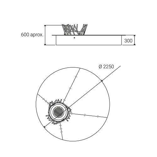 Кортен-сталь, используемая в производстве, обладает способностью к самообновлению и формированию защитного оксидного слоя. Это обеспечивает долговечность конструкции без потери эстетических качеств. Диаметр камина составляет 225 см при высоте 60 см, что делает его заметным элементом ландшафтного дизайна.