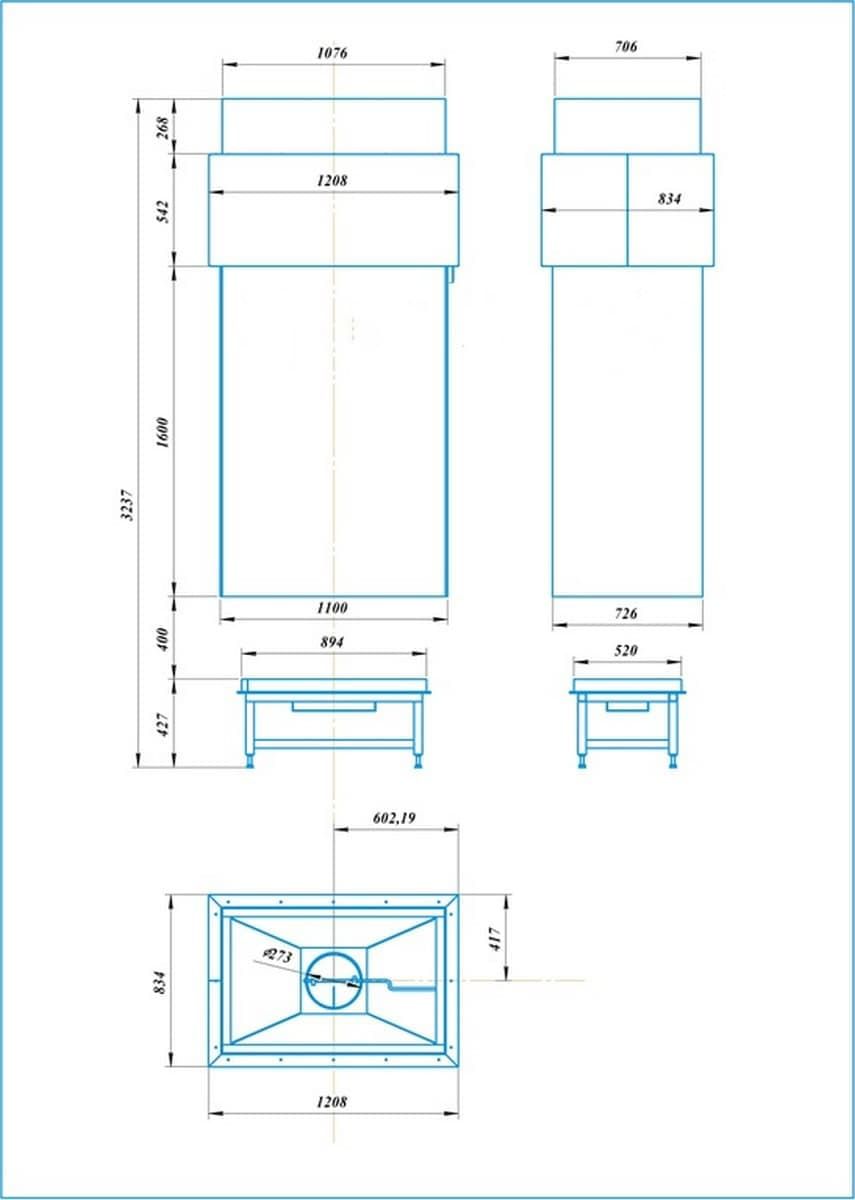 Конструкция камина предусматривает возможность изменений высоты и формы, что позволяет адаптировать его под конкретные требования помещения. Основание в виде тумбы может быть выполнено в мобильном варианте с использованием специальных ножек. Корпус изготовлен из прочной конструкционной стали с термостойким покрытием, выдерживающим температуры свыше 1000°C.