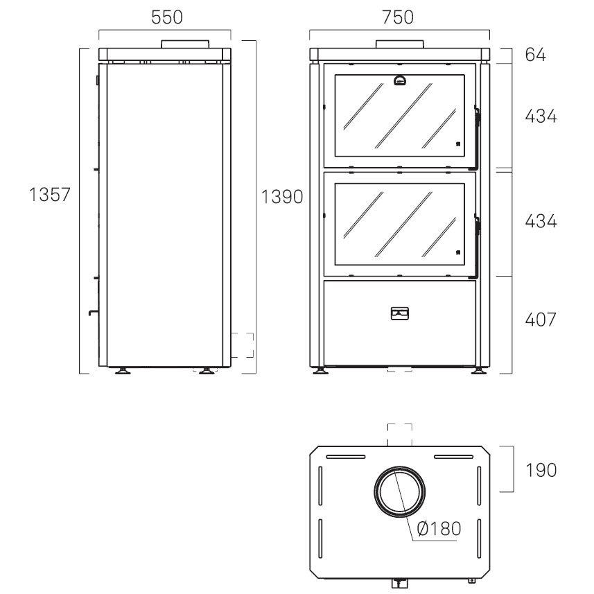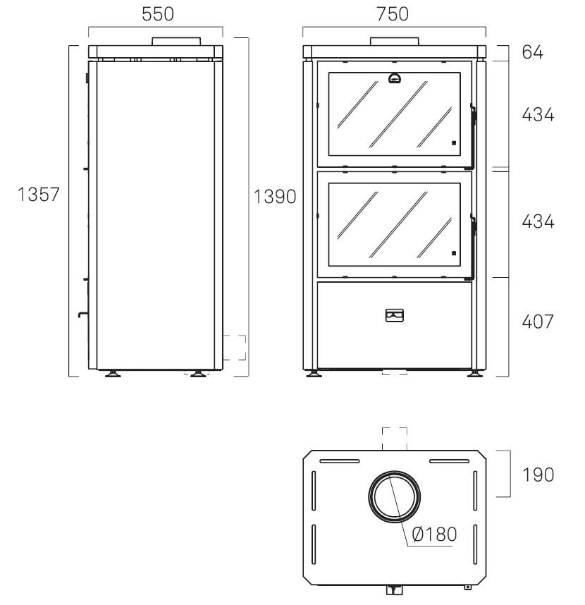 Модель оснащена системой подачи воздуха извне, что обеспечивает эффективное горение и чистоту стекла. Стальной корпус в сочетании с вермикулитовой топкой гарантирует долгий срок службы и стабильную теплоотдачу. Диаметр подключения дымохода составляет 180 мм с верхним выводом.