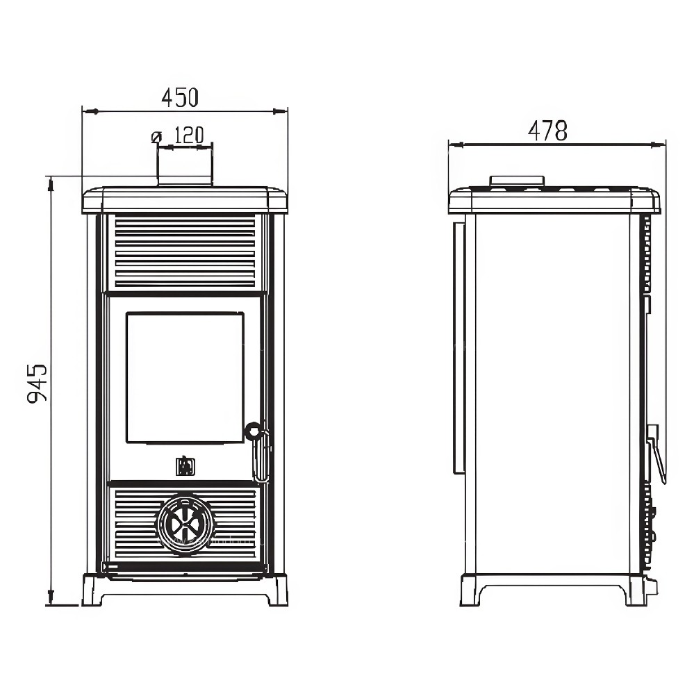 Конструктивные особенности включают внутренние стенки с ребрами жесткости для увеличения срока службы, большой зольный ящик для удобства обслуживания и герметичность, обеспечиваемую огнестойкими уплотнительными шнурами. Верхнее подключение дымохода диаметром 120 мм упрощает монтаж и интеграцию в существующую систему.